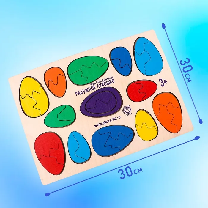 Игра «Радужное лукошко» представляет собой планшет размером А4 с 13 рамками-вкладышами овальной формы , 6 из которых маленького размера и 7 — большого размера, окрашенных в цвета радуги и поделенных различным образом: маленькие на 2 части , а большие — на 3 части.