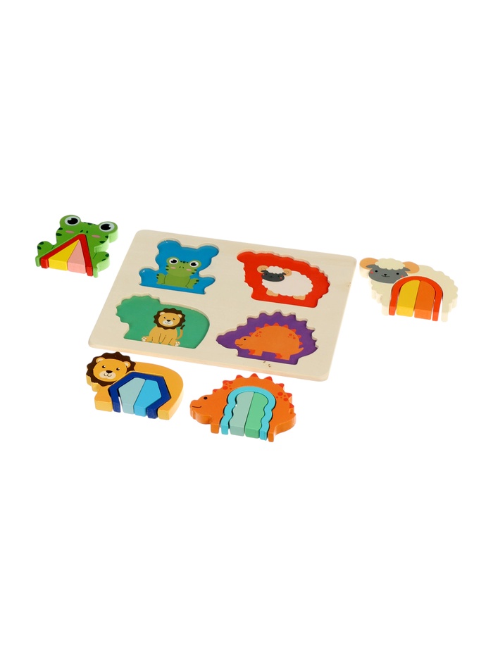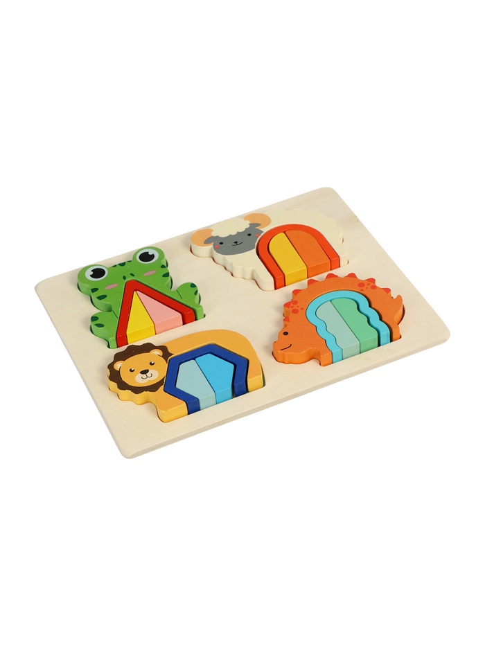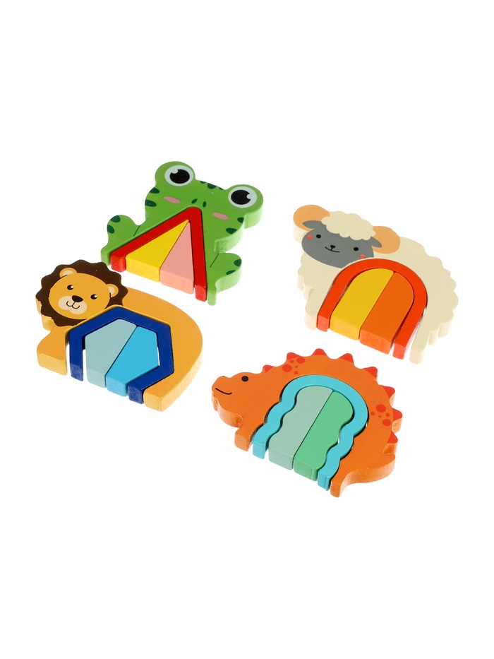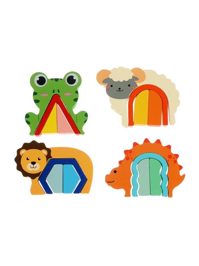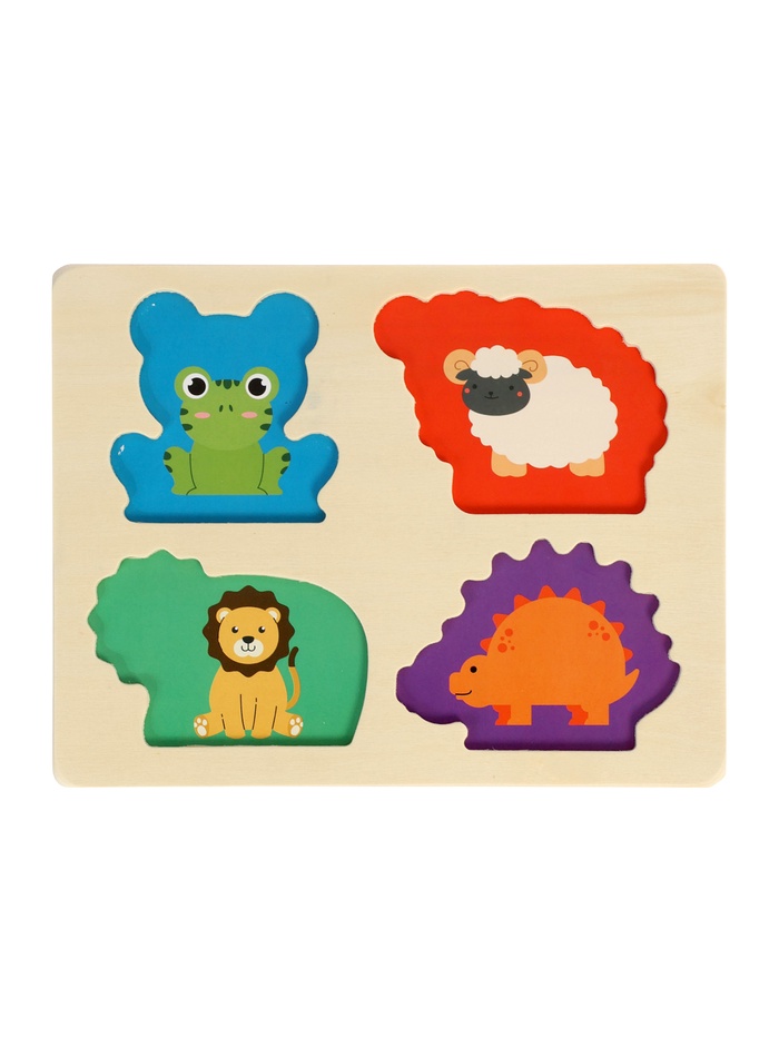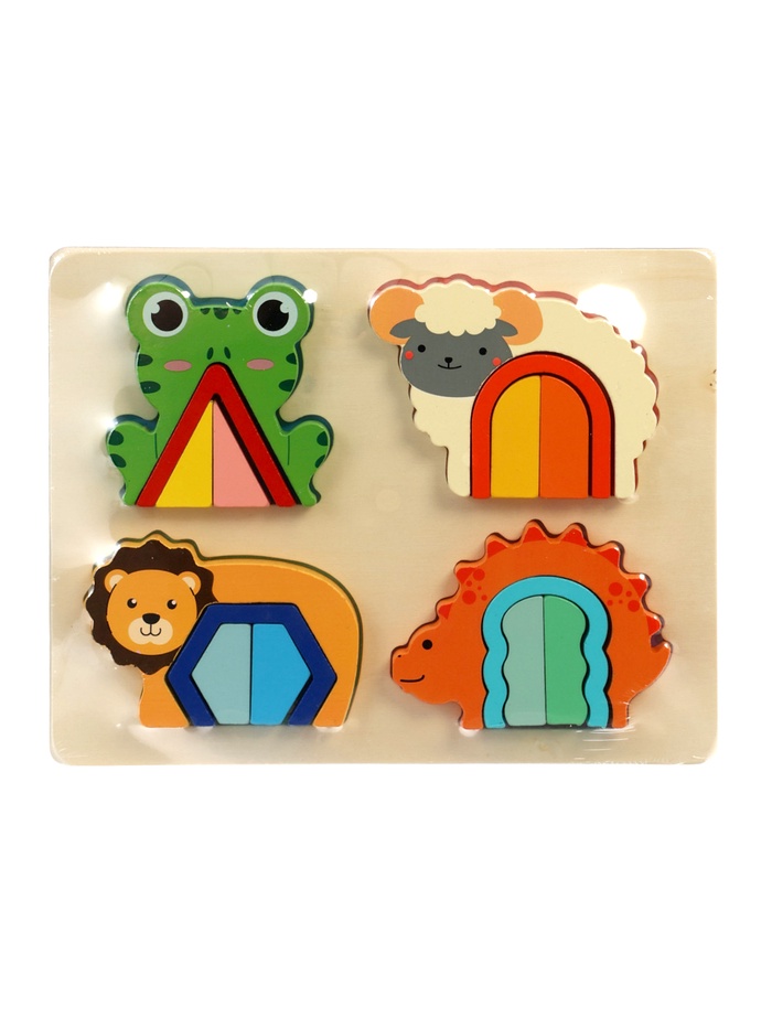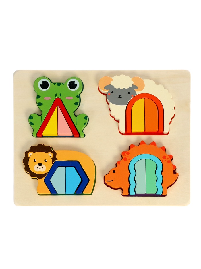 Деревянный сортер «Животные» — это рамка-вкладыш для детей от 4 лет, где каждая из четырёх зверушек скрывает внутри мини-головоломку. На общей подложке размещаются лягушка, овечка, львёнок и динозаврик. Внутри каждой фигурки — арочный вырез с геометрическими вкладышами, которые можно вынимать, сортировать и возвращать на место. Всего 16 деталей: 4 внешних силуэта и 12 внутренних элементов — игра получается многослойной и увлекательной как для мальчиков, так и для девочек.