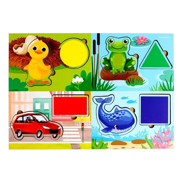 Данная головоломка поможет малышу улучшить сенсорное восприятие, а также изучить животных. Крохе предстоит соотнести элемент вкладки с подходящим отверстием в основе. Хотя эти упражнения кажутся довольно простыми, такие действия очень полезны для развития логического мышления.