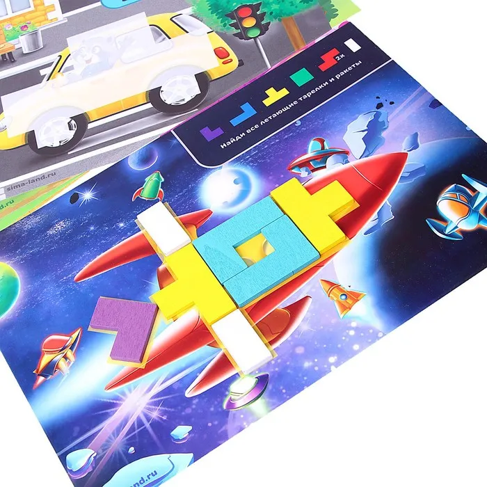 - Смысл игры — заполнить пустое пространство в деревянной основе фигурами разных форм и цветов.
