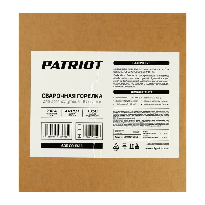 Горелка для аргонодуговой TIG сварки PATRIOT, для аппаратов TIG и MMA, 4 м, 200 А, DX50 — Характеристики