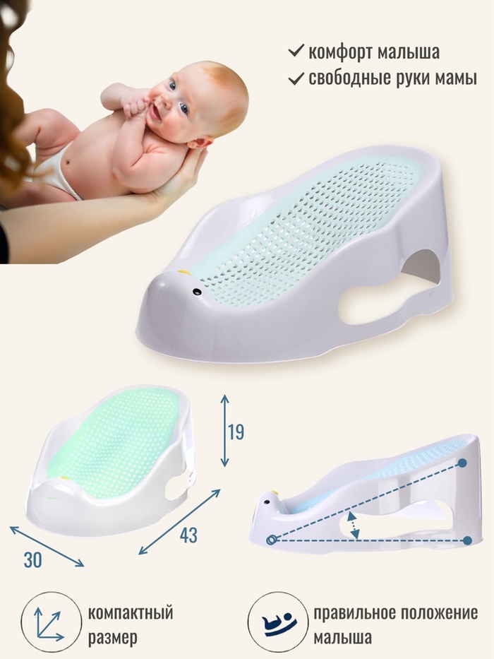 Горка для купания новорожденных Крошка Я, 0-6 мес., р-р 43×30×19 см, белый/мятный — Характеристики