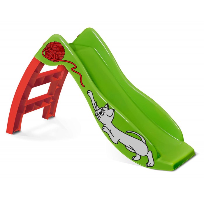 - Тематический дизайн: Фигурка котенка с клубком превращает обычную горку в элемент сюжетной игры. Ребенок придумывает истории, развивая воображение.