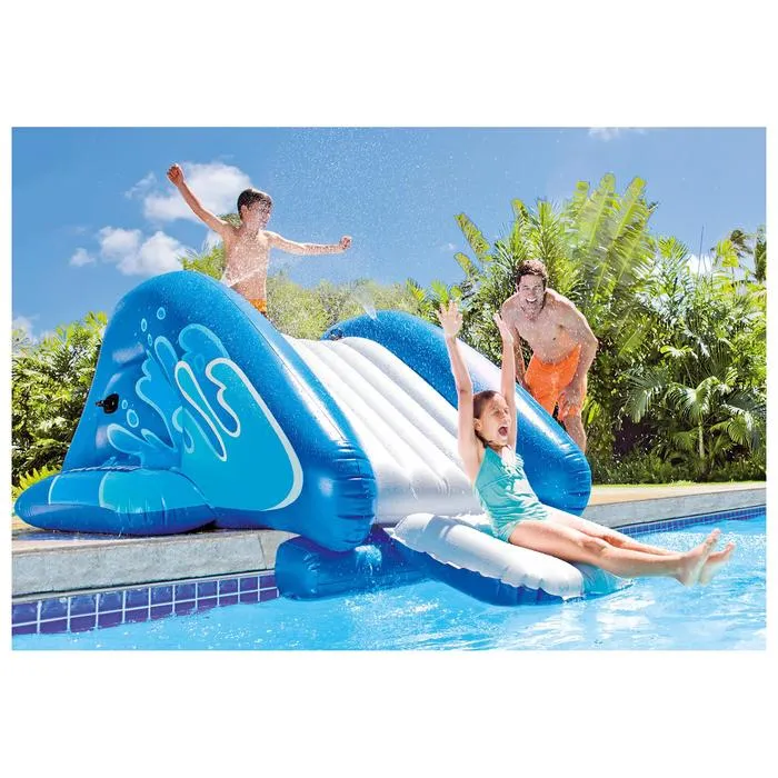 Надувная водная горка порадует каждого члена семьи и сделает отдых на природе более приятным и оригинальным. Устанавливается рядом с вкапываемым бассейном или на лужайке. Подключите к садовому шлангу — вода из него поступит в распылитель наверху горки — и катайтесь с удовольствием.