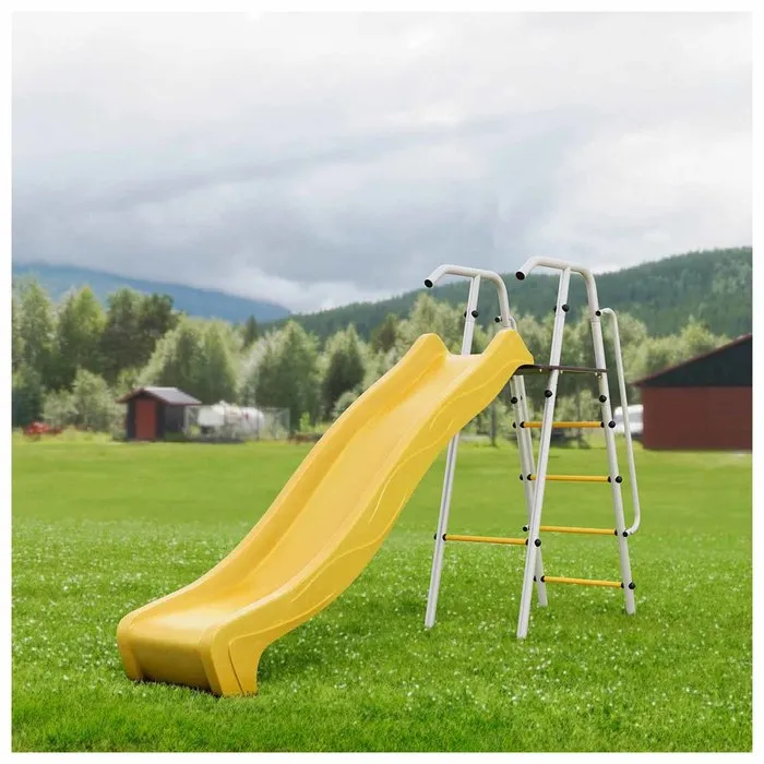 Горка выполнена из пластика, который не выцветает, сильно не нагревается на солнце и не леденеет зимой. Стальной каркас обеспечивает надёжность и долговечность эксплуатации.