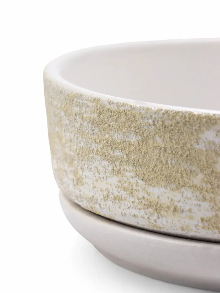 Бонсайница «Нави» - элегантный керамический горшок для кактусов и суккулентов. Белая поверхность с золотистыми вкраплениями придаёт изделию благородный вид. Диаметр 15 см при высоте 5,5 см идеален для настольного размещения. Объём 600 мл оптимален для миниатюрных растений. В комплекте с бонсайницей идёт практичный поддон.