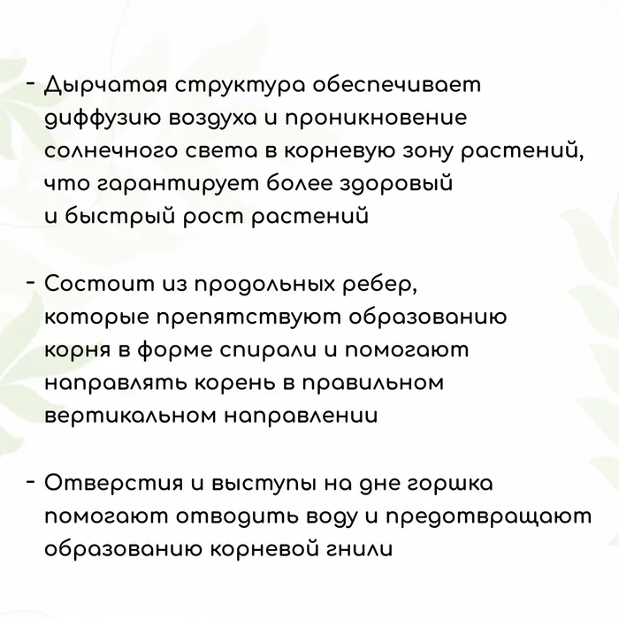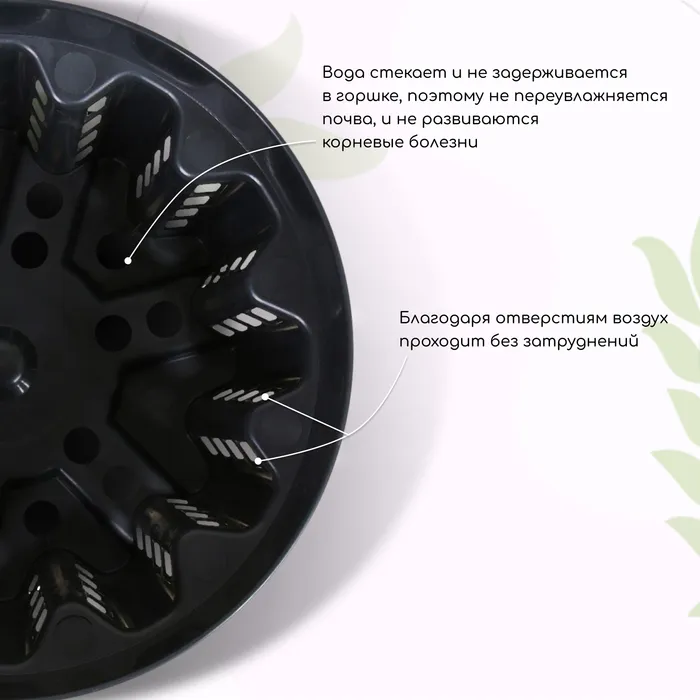 - Отверстия и выступы на дне горшка помогают отводить воду и предотвращают образованию корневой гнили.