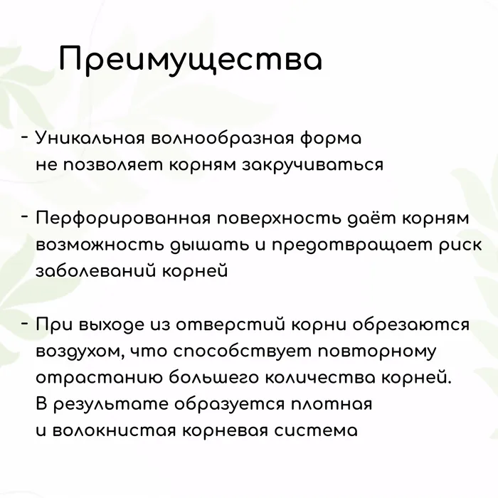 Благодаря отверстиям в стенках вода легко стекает и не задерживается в горшке, поэтому не переувлажняется почва, и не развиваются корневые болезни. Через боковые отверстия происходит воздушная подрезка корней, а это означает, что вся среда внутри горшка наполняется корнями.