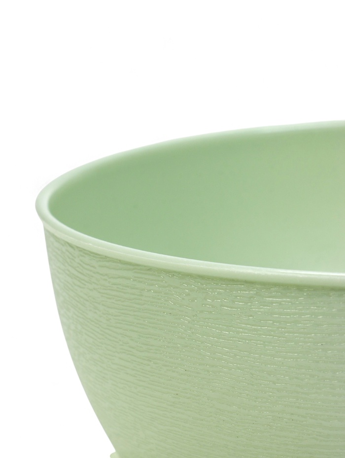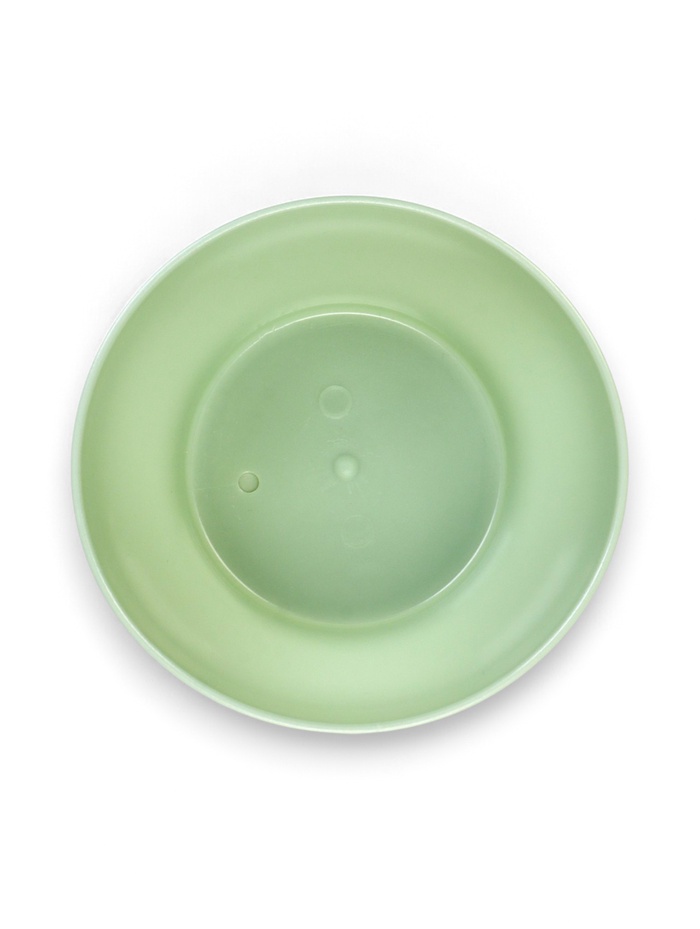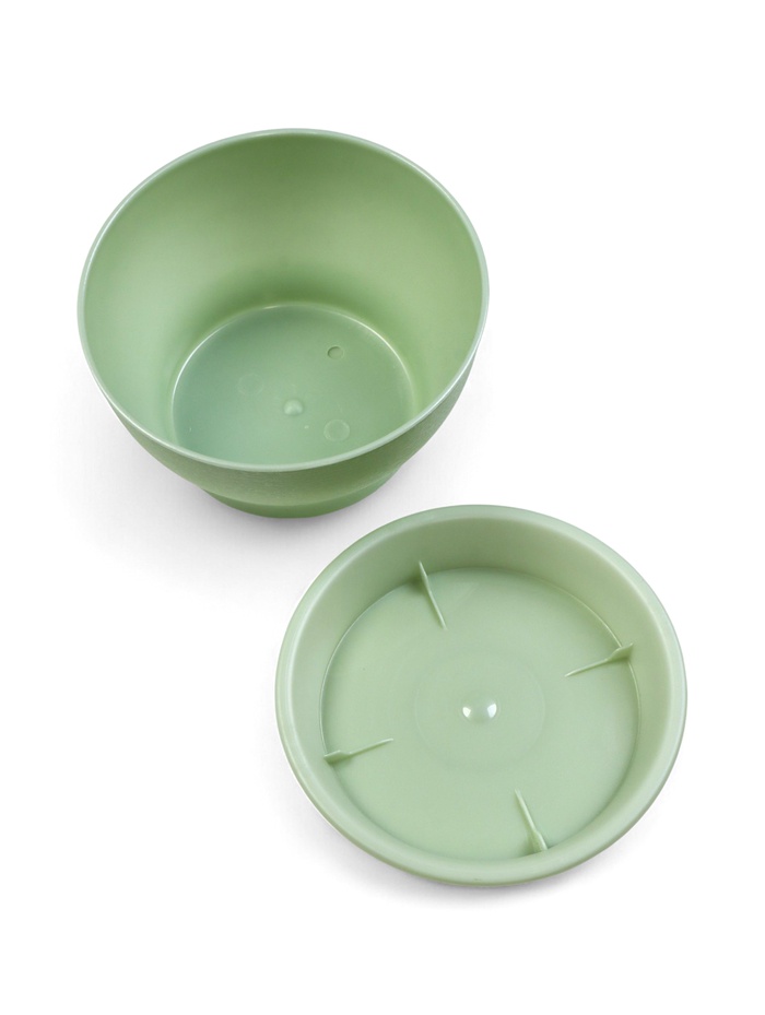 Зелёный пластиковый горшок с поддоном — практичное решение для комнатного цветоводства. Цвет гармонично сочетается с листвой растений, создавая целостную композицию.