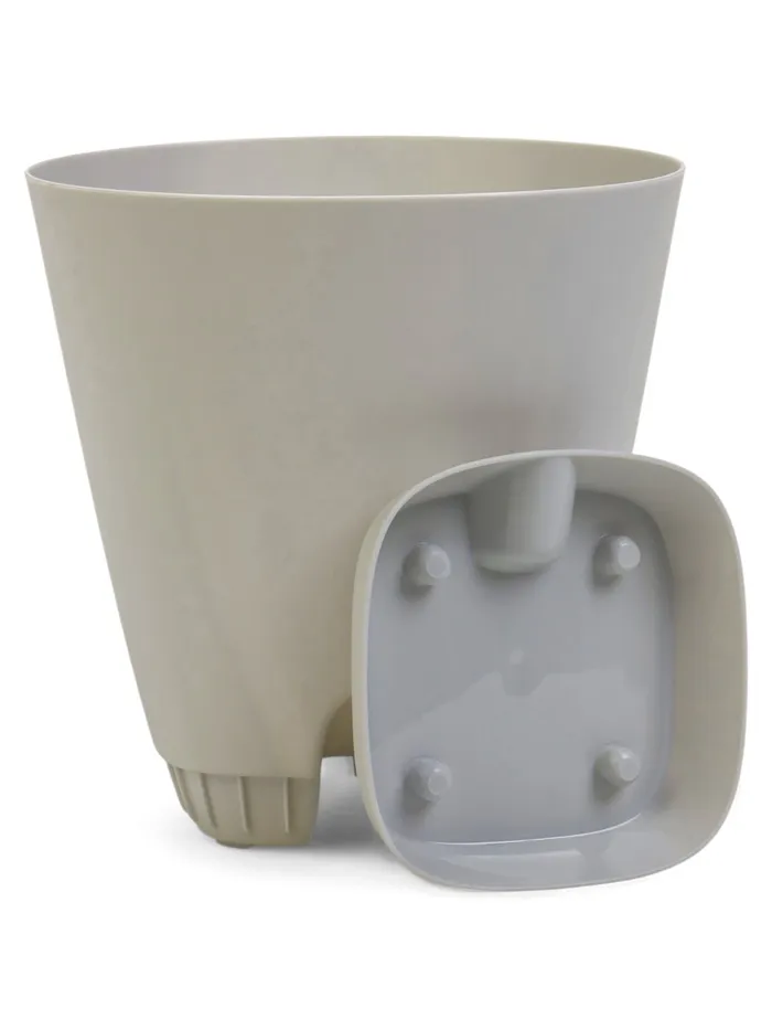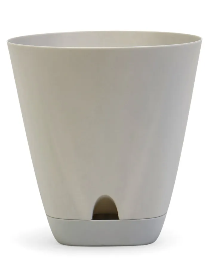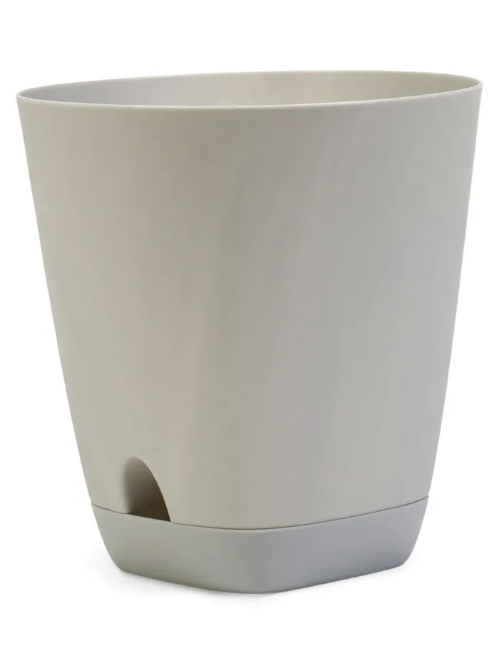 Серый пластиковый горшок «Гранд» с инновационной системой прикорневого полива. Стильное и практичное настольное решение для вашей зелени. Объем 2 литра, диаметр 14.5 см, высота 15 см. Встраиваемый поддон идёт в комплекте с горшком.