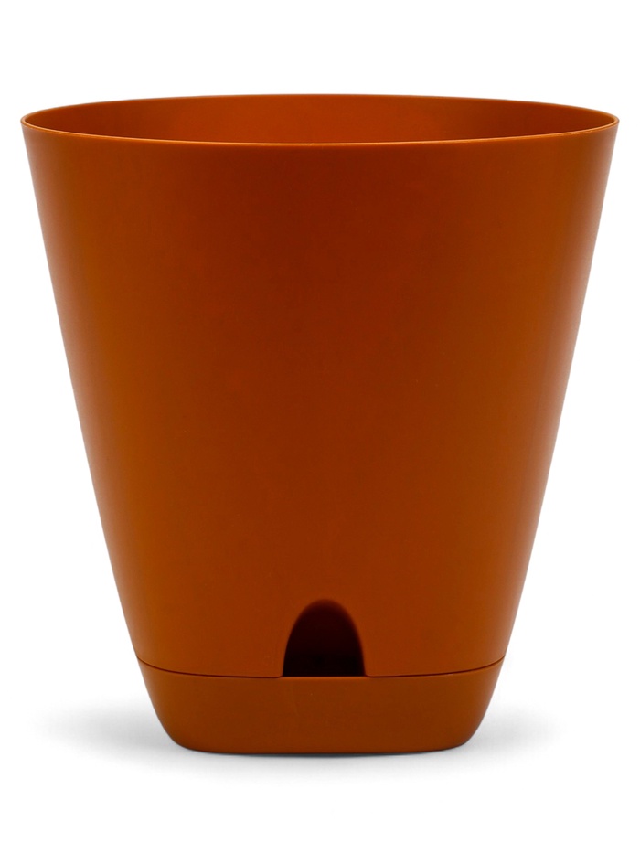 Коричневый пластиковый горшок для цветов «Гранд» увеличенного объема с системой прикорневого полива. Солидное настольное решение для растений. Объем 4 литра, диаметр 19 см, высота 20 см. Комплектуется встроенным поддоном.