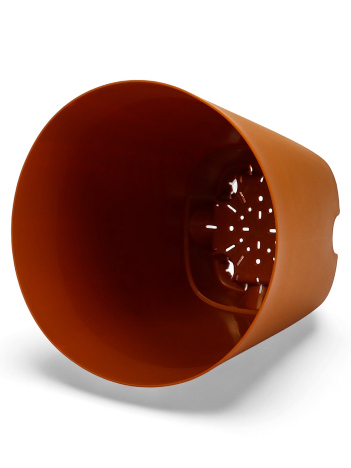 Коричневый пластиковый горшок для цветов «Гранд» максимального объема с системой прикорневого полива. Профессиональное решение для крупномерных растений. Объем 8 литров, диаметр 24 см, высота 25 см. Комплектуется усиленным встроенным поддоном.