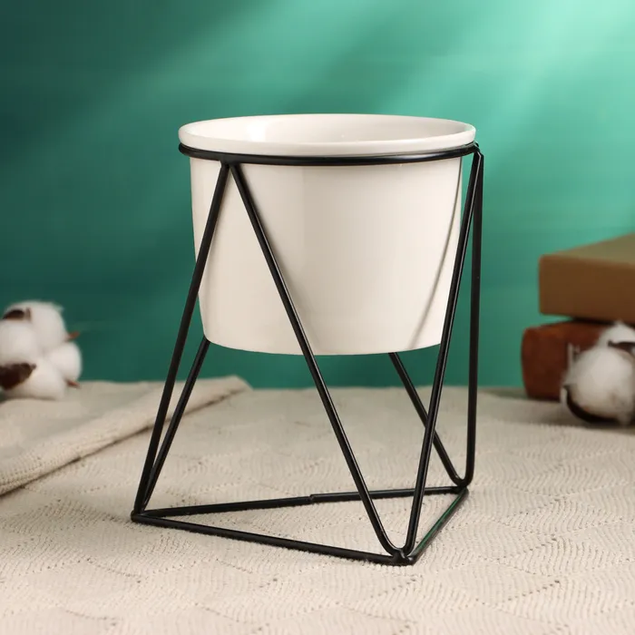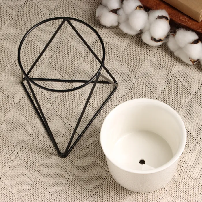 Горшок для цветов «Грани» керамический, 400 мл, 14×11×15 см, на чёрной металлической подставке, белый — Характеристики