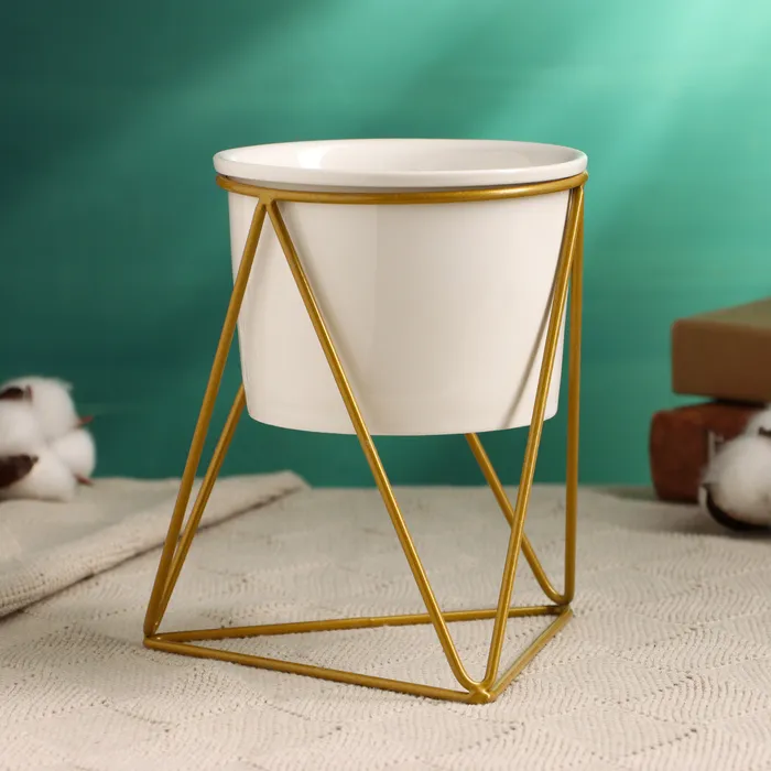 Горшок для цветов «Грани» керамический, 400 мл, 14×11×15 см, на золотистой металлической подставке, белый — Характеристики
