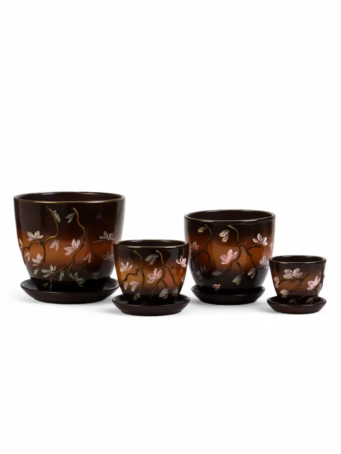 Набор керамических горшков «Миндаль» в коричневом оттенке — природное украшение для ваших растений. В комплекте 4 практичных размера (5 л, 2.5 л, 1 л, 0.4 л) из качественной керамики. Идеально подходят для создания композиций на подоконниках, столах и полках. Каждый горшок комплектуется поддоном для защиты поверхностей.
