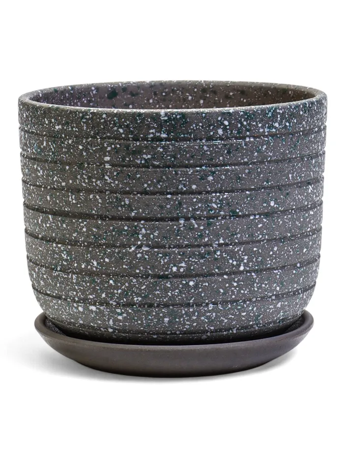 - Сдержанная эстетика: Спокойный серый цвет и матовая текстура делают этот горшок универсальным. Он не отвлекает внимание на себя, выгодно выделяя сочную зелень и яркие цветы.