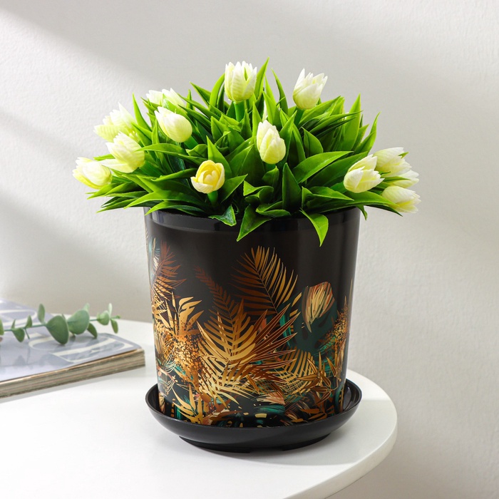Горшок для цветов с поддоном Доляна «Голди. Листья», 1.6 л, d=14 см, h=15.5 см, пластиковый, цвет чёрный