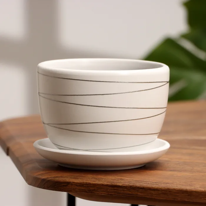 Функциональность и универсальность: горшок можно разместить как на столе, так и на полу, что открывает широкие возможности для дизайна интерьера. Базовая форма и включенный поддон обеспечивают удобство в уходе за растениями и предотвращают переполнение водой. Этот горшок – отличный выбор для тех, кто ценит стиль и функциональность в изделиях для дома.