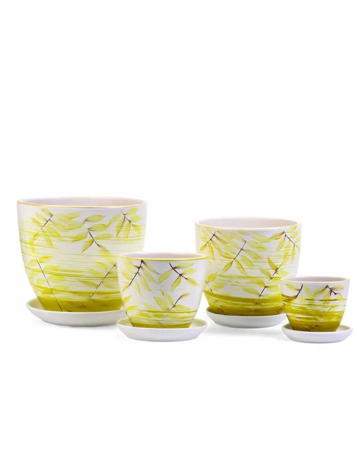 Набор керамических горшков «Тропики» в свежем белом цвете — идеальное решение для создания зелёного уголка. В комплекте 4 горшка (5 л, 2.5 л, 1 л, 0.4 л) с тропическим орнаментом. Подходят для размещения на подоконниках, столах и открытых полках. Каждый горшок комплектуется практичным поддоном.