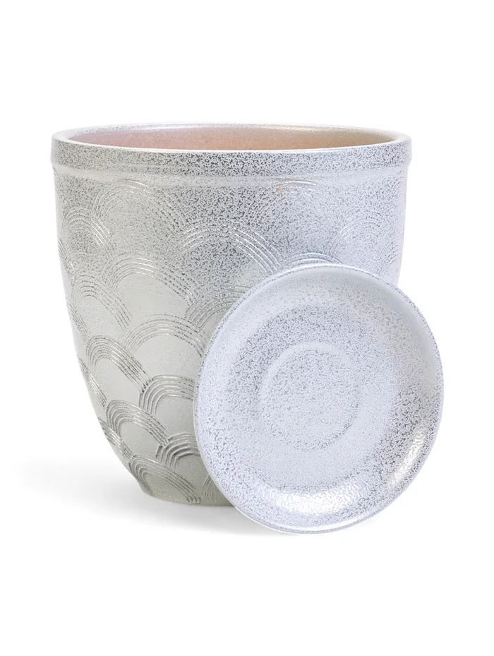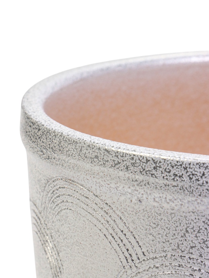 Керамический горшок «Узор» с поддоном — это стильное решение для небольших пространств. Геометрический рельеф и металлический блеск создают лаконичный современный акцент в интерьере.