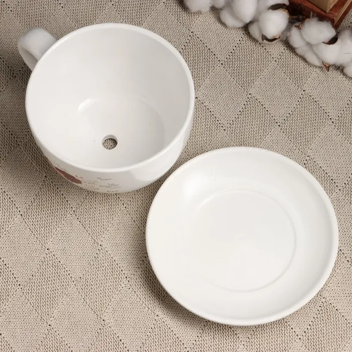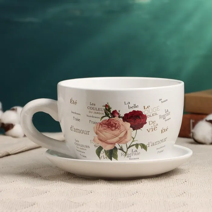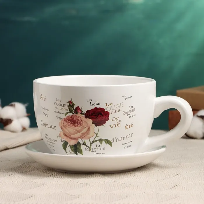 Горшок для цветов в форме чашки «Эмма: цветы» керамический, с поддоном, 1.2 л, 19×15×10 см, белый с рисунком — Характеристики