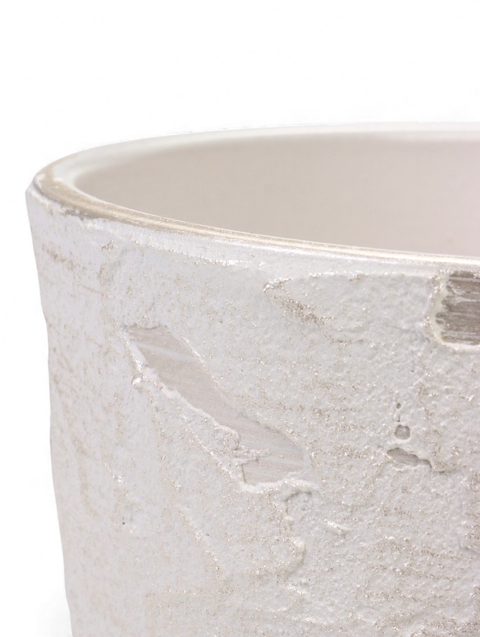 - Белый цвет с фактурой: нейтральный оттенок служит универсальным фоном, а рельефный узор создаёт игру света и тени. Такое сочетание делает горшок заметным декоративным элементом, не перегружая пространство.
