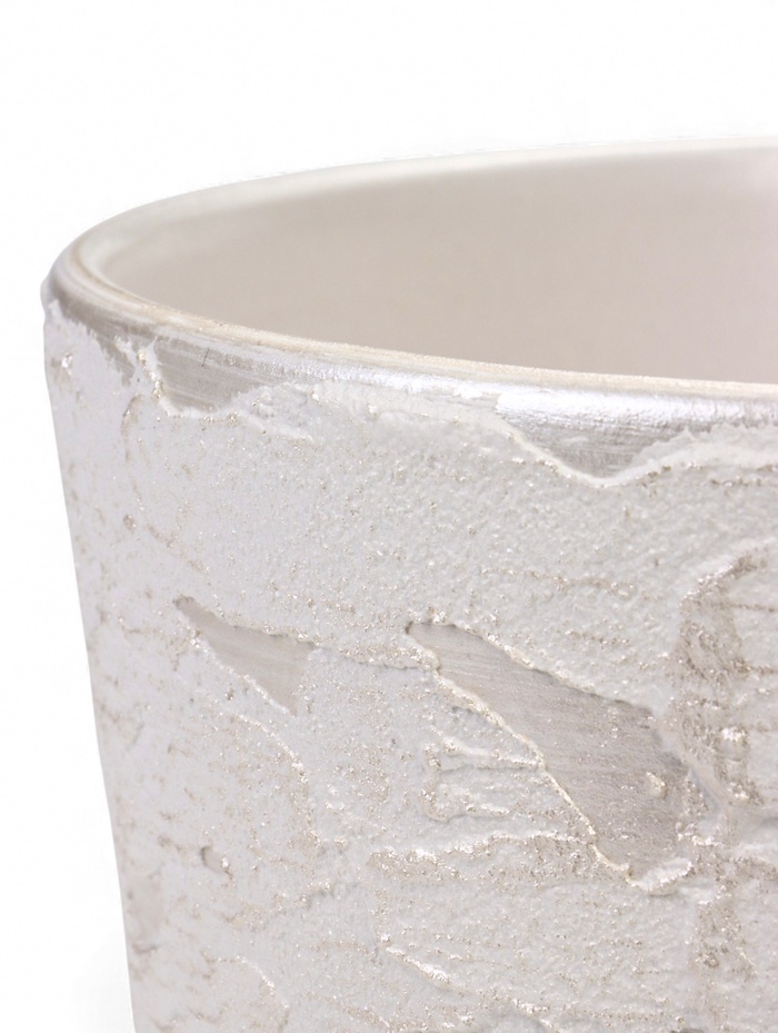 - Белый цвет с фактурой: нейтральный оттенок служит универсальным фоном, а рельефный узор создаёт игру света и тени. Такое сочетание делает горшок заметным декоративным элементом даже без растения.