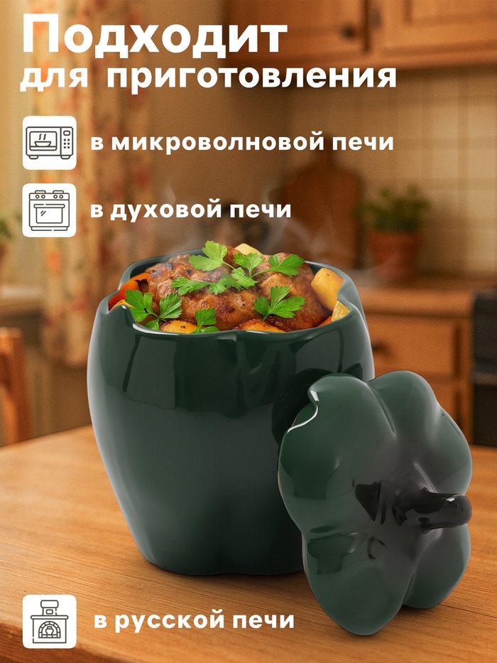 Керамический горшочек в форме перца — не просто посуда для духовки, а свежий акцент на кухне, который возвращает радость в повседневную готовку. Объём 800 мл — идеален для порционных запеканок, овощей, мяса или сытных гарниров. Зелёный цвет и натуральная форма напоминают о лете, овощном рынке и домашнем уюте — ещё до того, как вы открыли духовку.