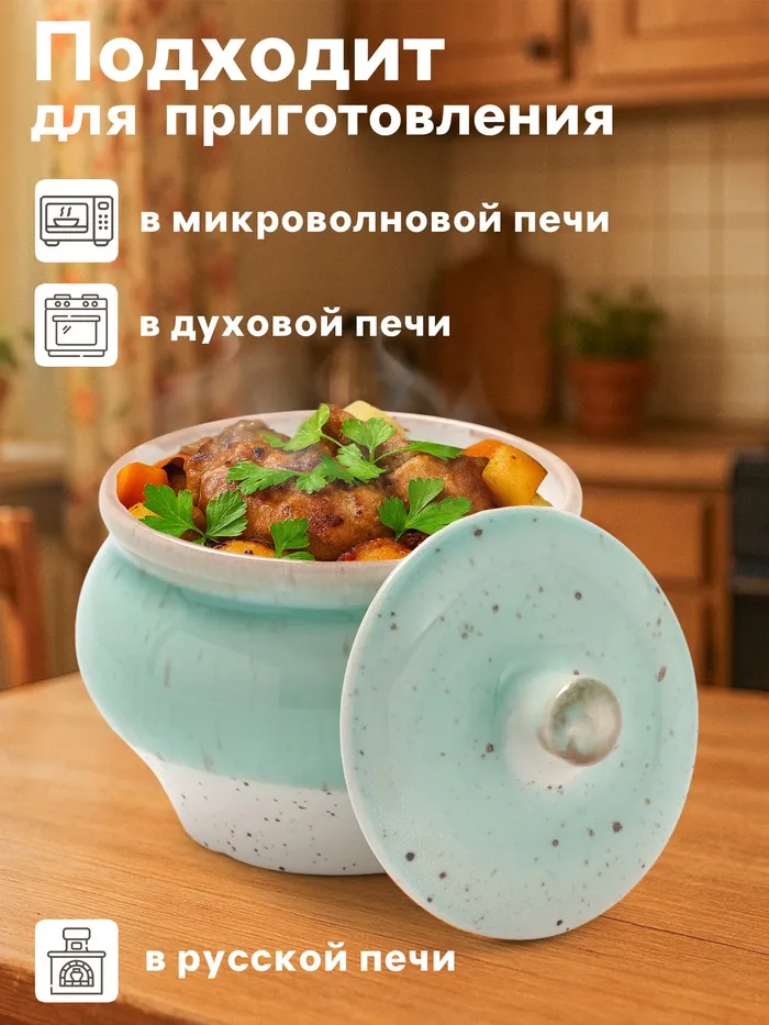 Бирюзовый цвет с глубиной оттенка создаёт акцент на столе, сочетается с нейтральной посудой. Форма горшка позволяет использовать его как сервировочную посуду, сохраняя тепло блюда durante подачи. Фарфор постепенно отдаёт тепло, предотвращая резкое остывание. Горшок становится многофункциональным элементом кухни — от запекания овощей до приготовления крем-супов с последующей подачей на стол.