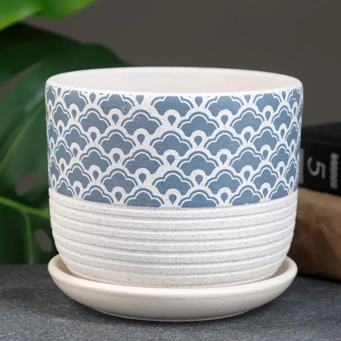 Горшок для цветов «Хоккайдо», керамический, с поддоном, 700 мл, белый с голубым орнаментом