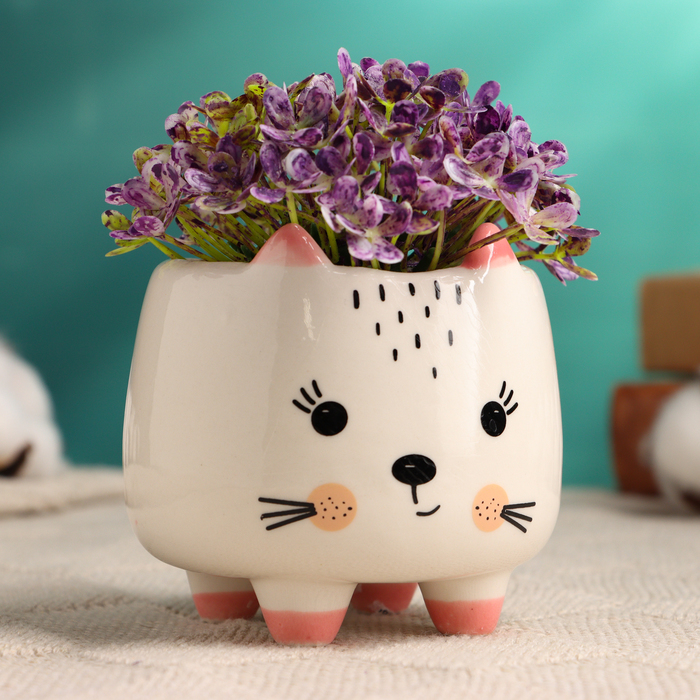 Горшок для цветов «Счастливый котик», 8×8×8 см, керамика, белый