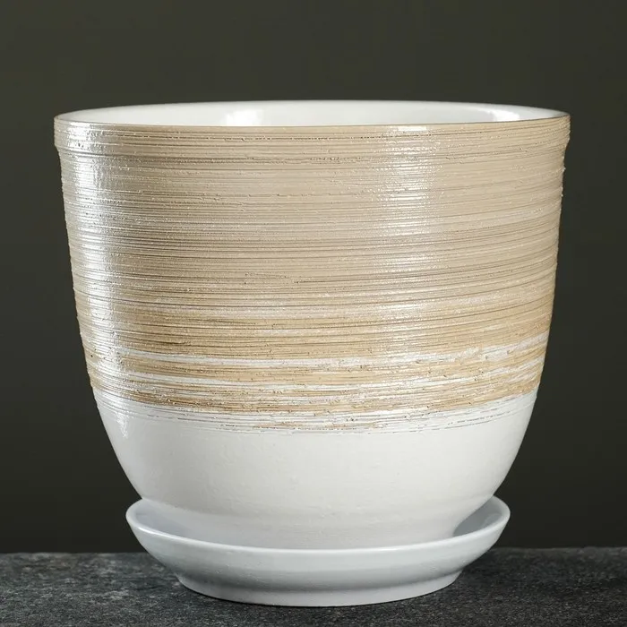 Горшок цветочный «Степь», керамический, с поддоном, 1.8 л, белый с бежевой полосой — Характеристики