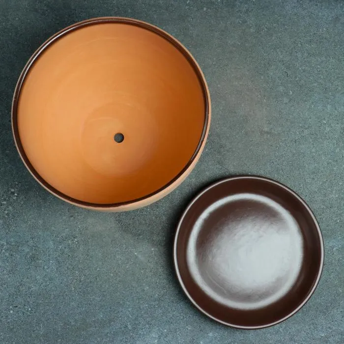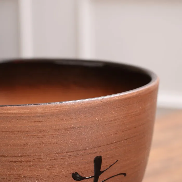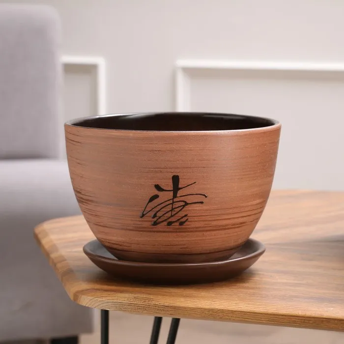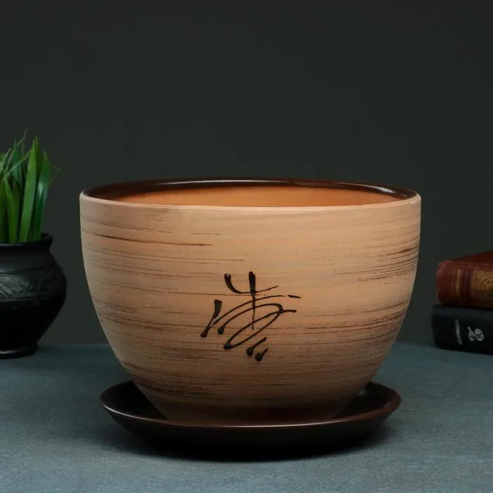 Горшок для цветов «Восток», керамический, с поддоном, 350 мл, коричневый с иероглифом