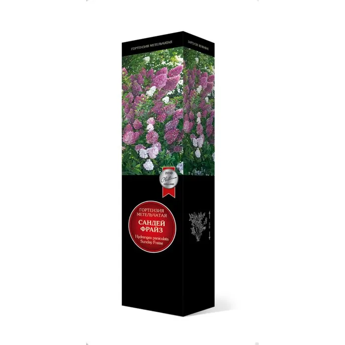 Сандей Фрай можно назвать миниатюрной, высота и ширина кустарника не превышает 1 м. Крона напоминает аккуратный шар, который не нуждается в специальной формировке. Зацветает уже на первом году. Ветви могут ломаться под весом крупных соцветий, поэтому их нужно привязывать к опоре. Пересадка выполняется нечасто – 1 раз на 5 лет. У гортензии Сандей Фрайз листья темно–зеленые, длинные, до 12 см. Цветы, диаметром 2,5 см, собраны в крупные, до 35 см в длину, пирамидальные соцветия. Сначала они окрашены только в белый цвет, но позже появляется розовый оттенок, а ближе к окончанию цветения – ярко–малиновый. Период цветения довольно долгий – с июня по октябрь.