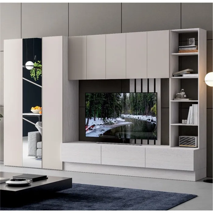 - Комплектация: 2 шкафа, ящики – предоставляют дополнительные возможности для хранения вещей. Полка над телевизором открытая. По бокам полки в стекле. Обеспечивает гибкость в использовании пространства и возможность адаптации под индивидуальные потребности.