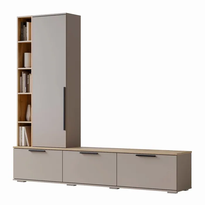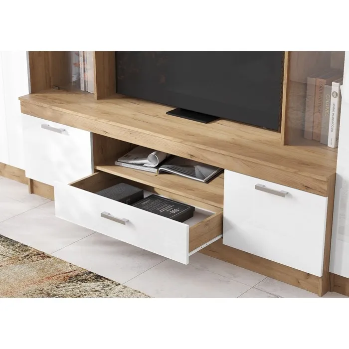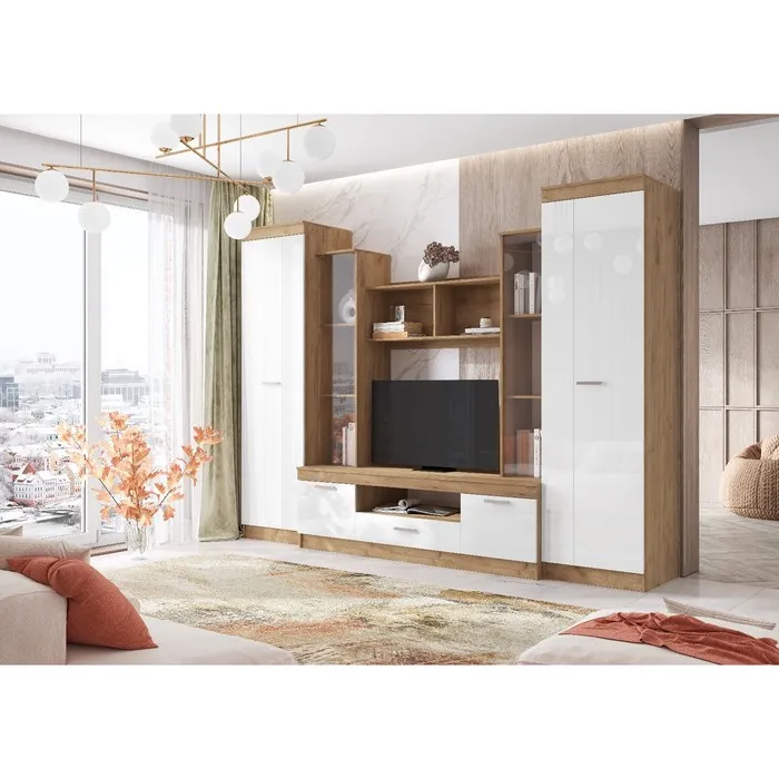 - Эстетичность: Комбинация дуба крафт и белого глянца делает эту гостиную не только функциональной, но и эстетически привлекательной.