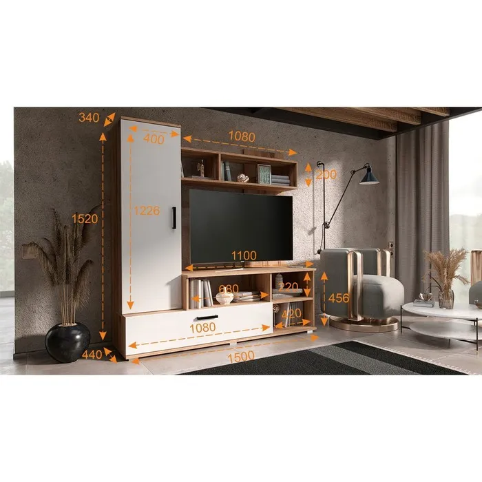 Гостиная Мини, 1500×440×1520 мм, белый глянец/дуб крафт — Характеристики