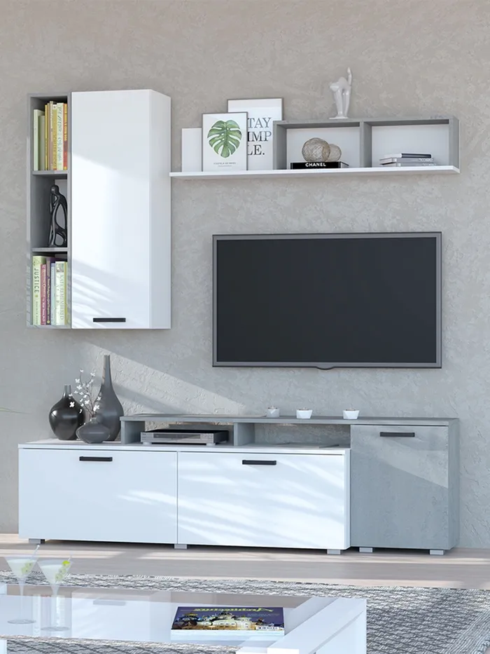 Контраст оттенков «бетонный камень» и белого цвета придаёт интерьеру динамику и подчёркивает современный характер помещения. Чёрные пластиковые ручки и аккуратная кромка ПВХ создают изящный акцент, компактные размеры позволяют установить гарнитур даже в небольшой гостиной.