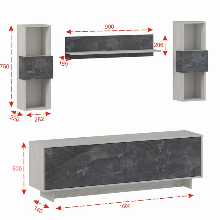 Гостиная Oskar mini, 1600х343х500, Сосна Белая Loft/Каспий темный — Характеристики