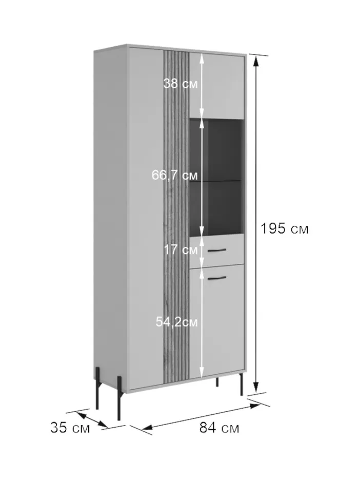 Стенка включает в себя различные модули, предназначенные для удовлетворения различных потребностей в хранении. Высокие ножки обеспечивают увеличенное расстояние от пола, появляется дополнительная зона для размещения декоративных элементов или коробок, делая пространство многофункциональным.