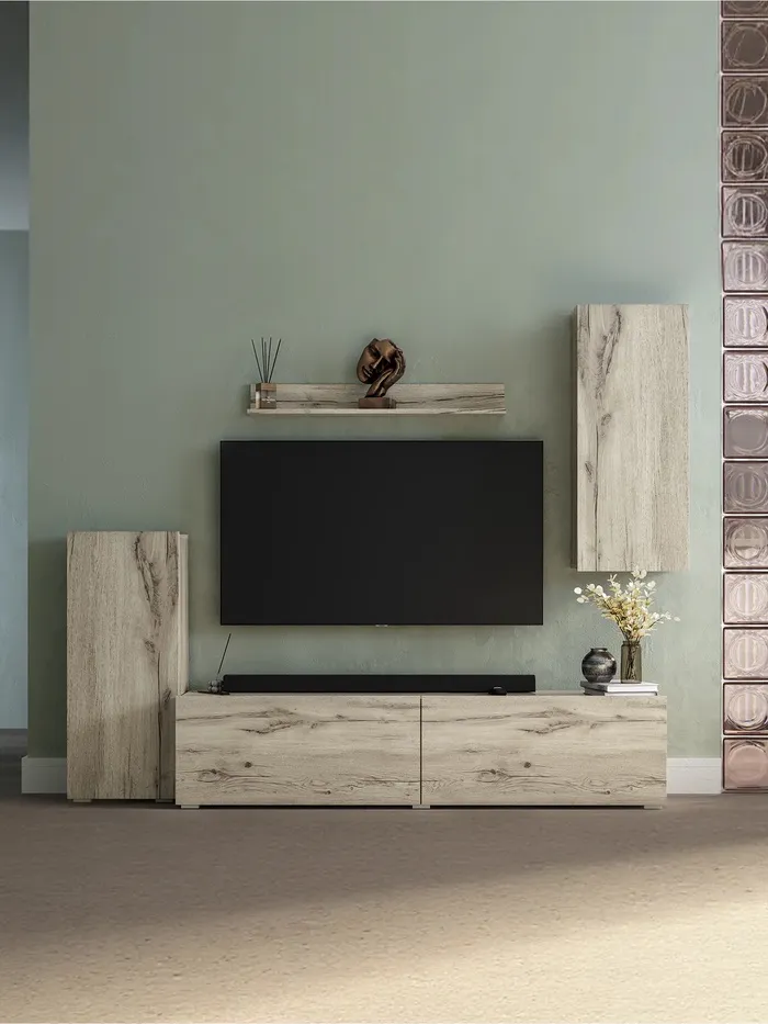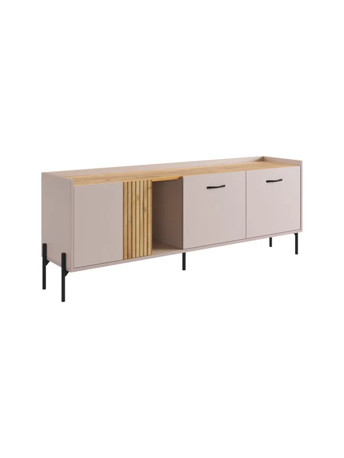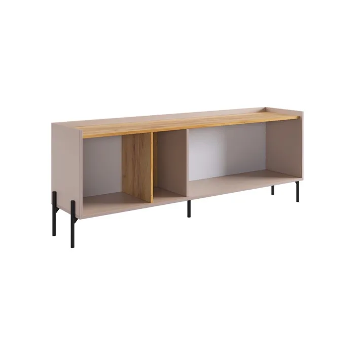 Выполнена в сдержанном современном стиле, сочетающем классические линии и современные решения. Подходит для размещения телевизора и других мультимедийных устройств. Сочетание оттенков кашемир и дуб крафт золотой добавляет элегантности и уюта в ваш интерьер.