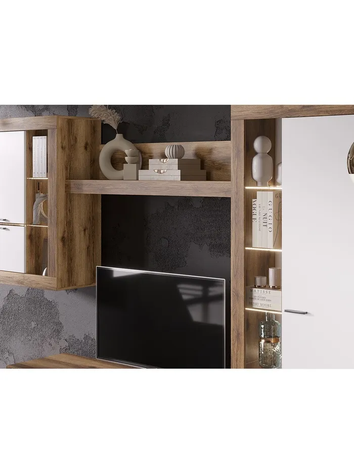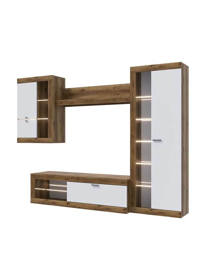 Дизайн в оттенках дуба делано и белого создаёт атмосферу уюта и современности, подходя для любителей классических и современных интерьеров. Гостиная обеспечит максимальный комфорт в использовании.