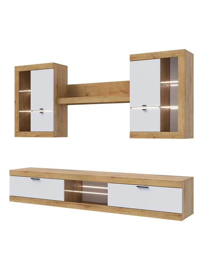 Дизайн в оттенках дуба делано и белого создаёт атмосферу уюта и современности, подходя для любителей классических и современных интерьеров. Гостиная обеспечит максимальный комфорт в использовании.