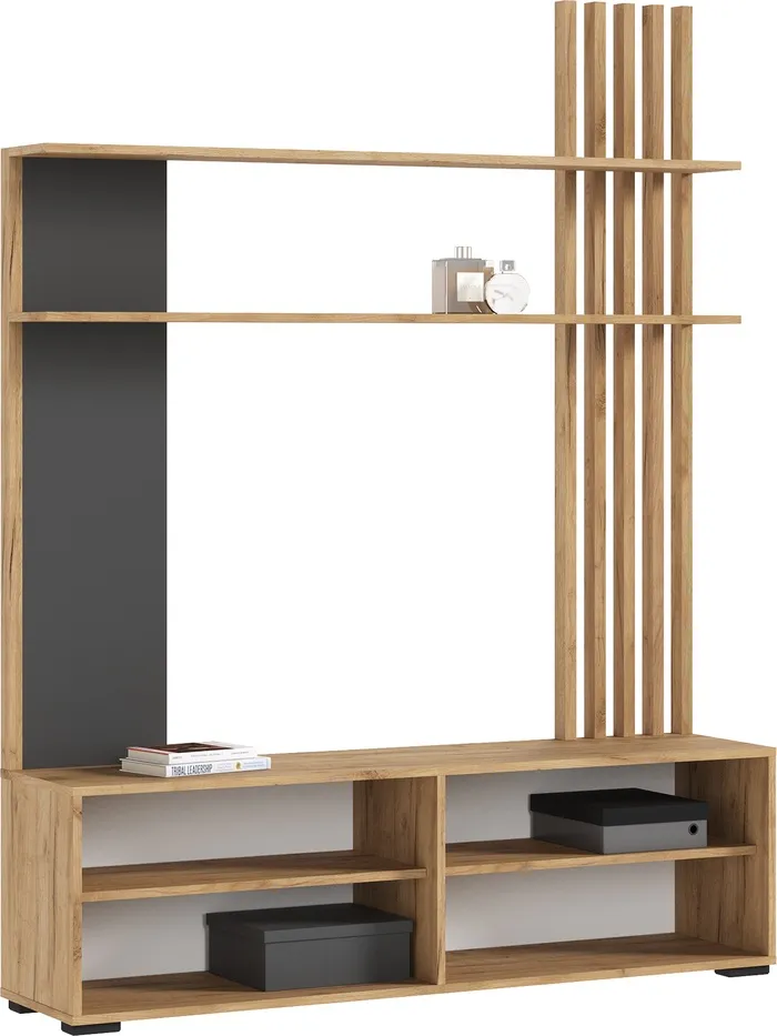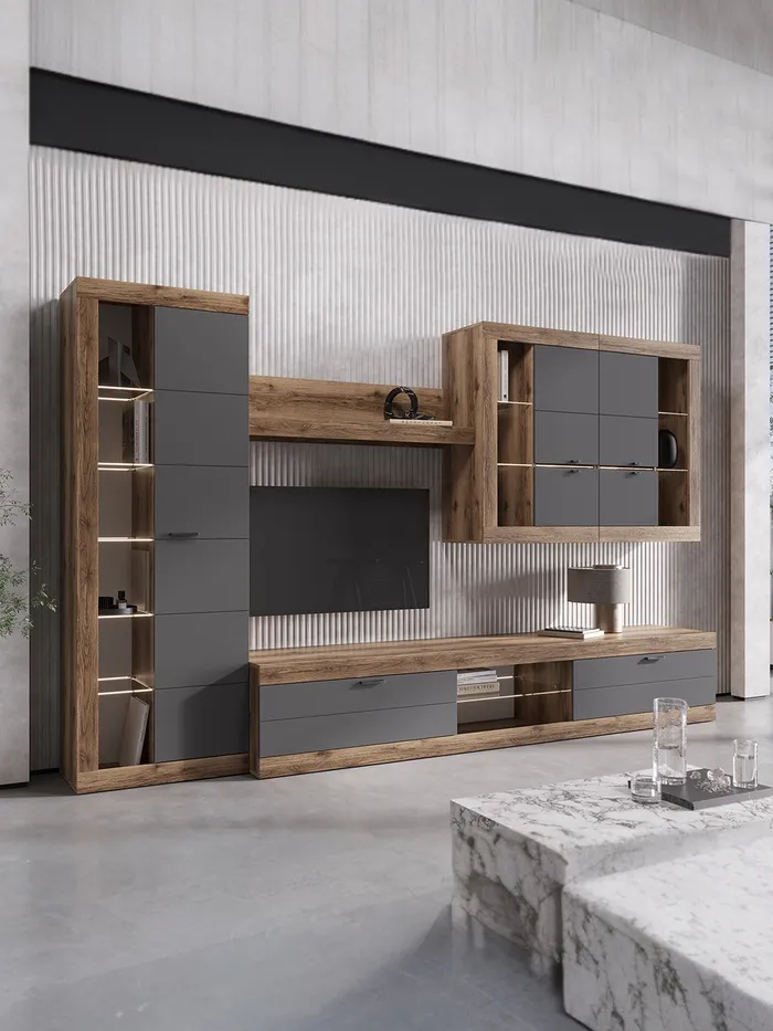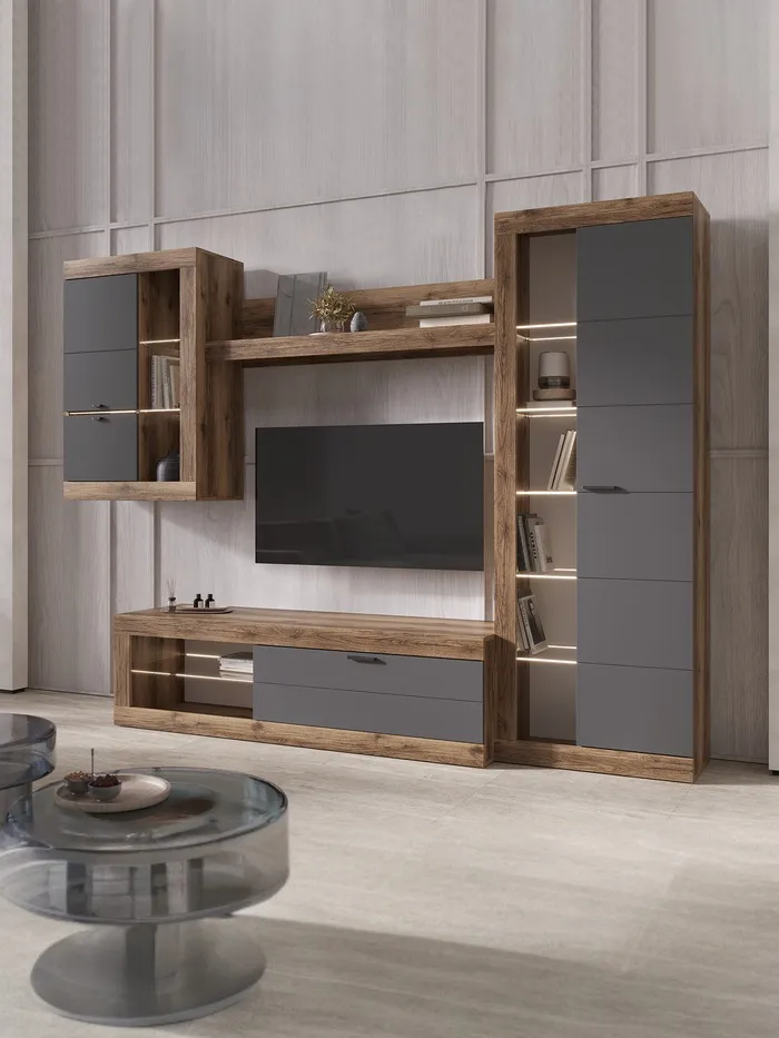 Дизайн в оттенках графита и дуба крафт создаёт атмосферу уюта и современности, идеально подходя для любителей светлых и естественных интерьеров. Гостиная обеспечит максимальный комфорт в использовании.
