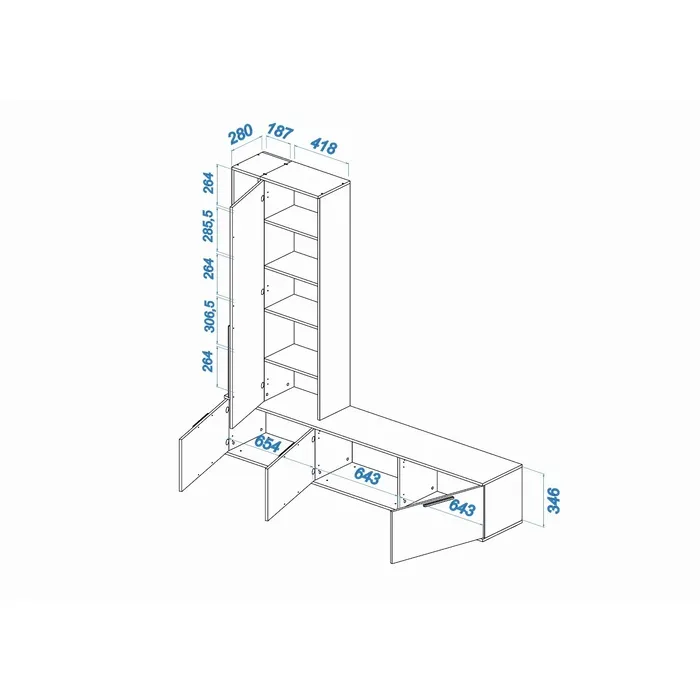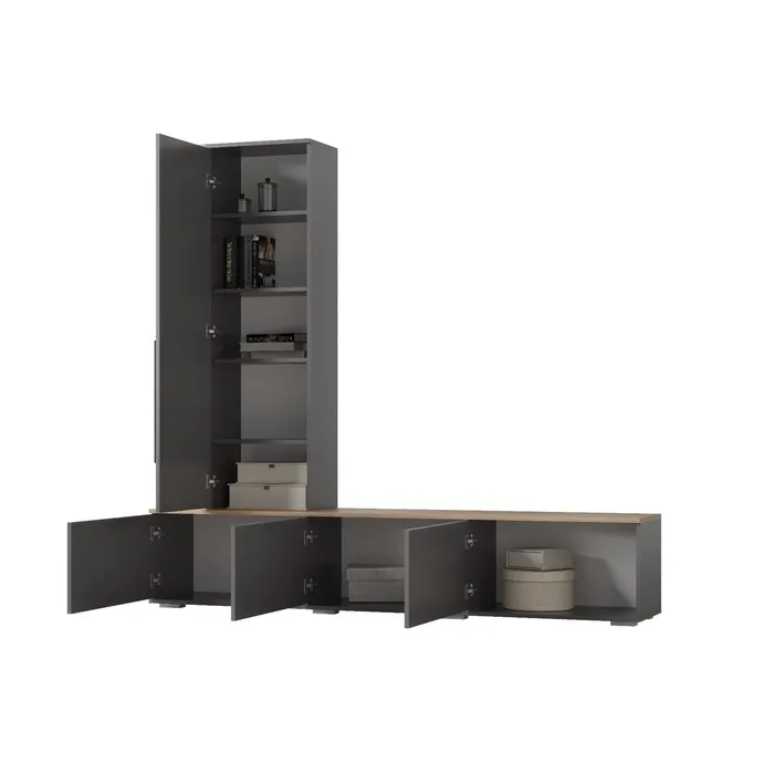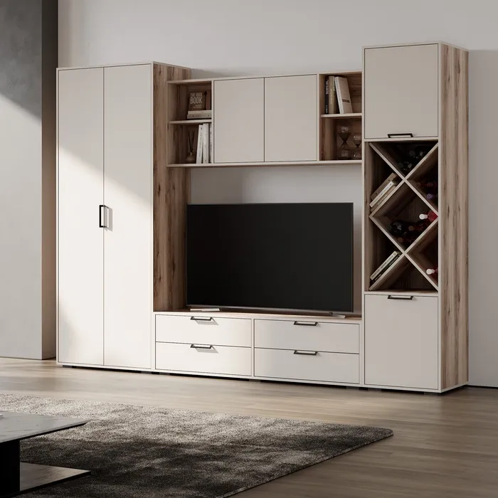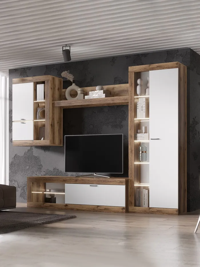 • Комплектация: Входят три распашные ниши для хранения ТВ принадлежностей снизу, четыре открытых полки для книг и сувениров и закрытый шкафчик с четырьмя вместительными полками. Обеспечивает гибкость в использовании пространства и возможность адаптации под индивидуальные потребности.