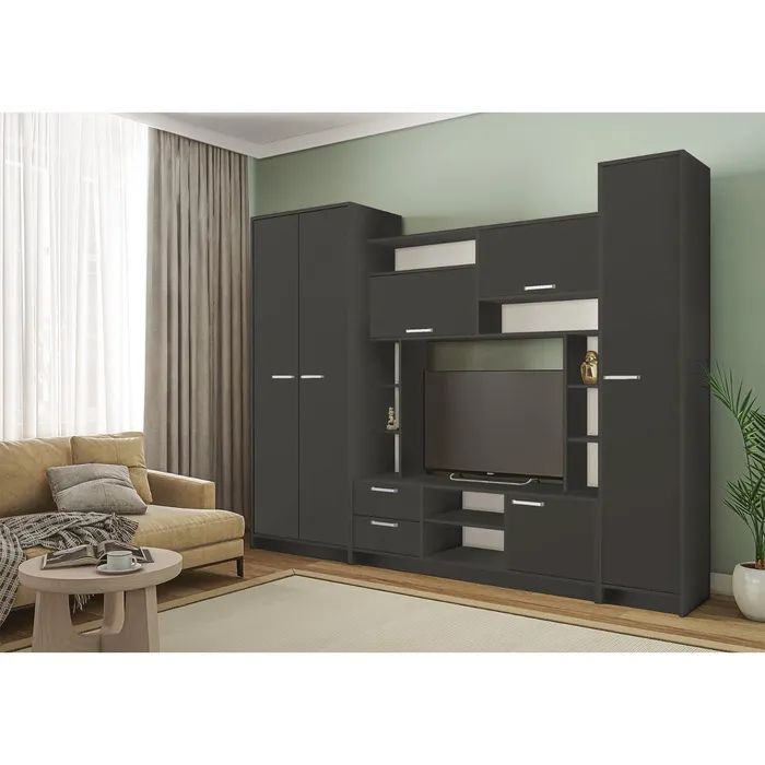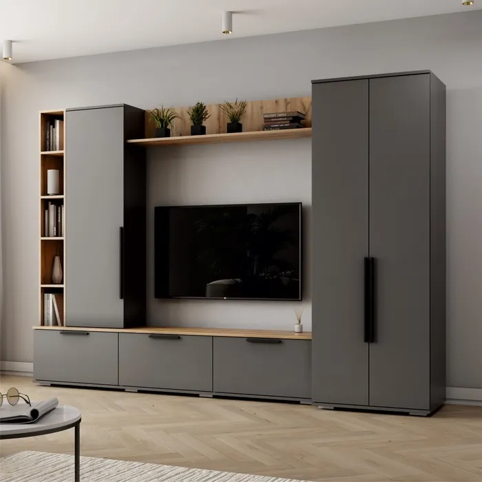 • Эстетичность: Комбинация графита и дуба вотан делает эту гостиную не только функциональной, но и эстетически привлекательной.