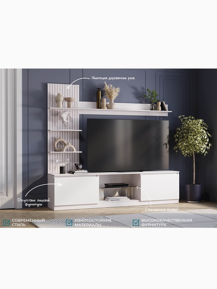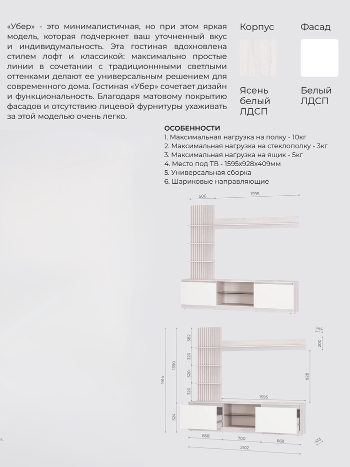 Гостиная «Убер ГС – 05», 2102×1914×413 мм, цвет ясень белый/белый — Характеристики