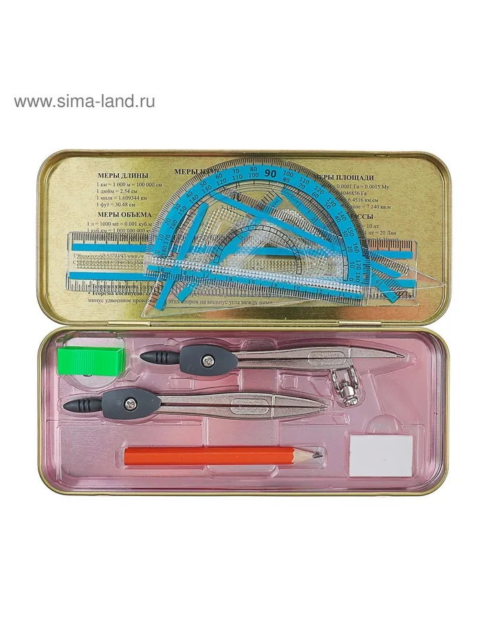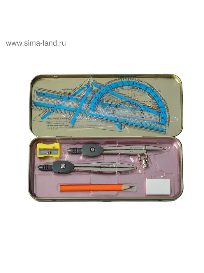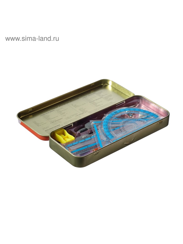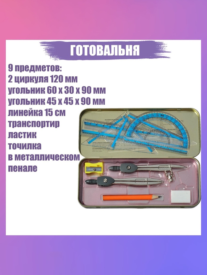 Готовальня 9 предметов: 2 циркуля 120 мм, угольник 60 х 30 х 90 мм, угольник 45 х 45 х 90 мм, линейка 15 см, транспортир, ластик, точилка, в металлическом пенале — Характеристики