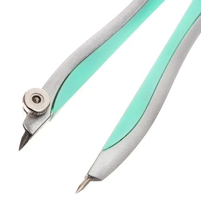 Металлический циркуль с максимальным радиусом 150 мм. В комплект входят сменные грифели в пластиковом контейнере. Упакован в удобный пластиковый футляр с европодвесом.