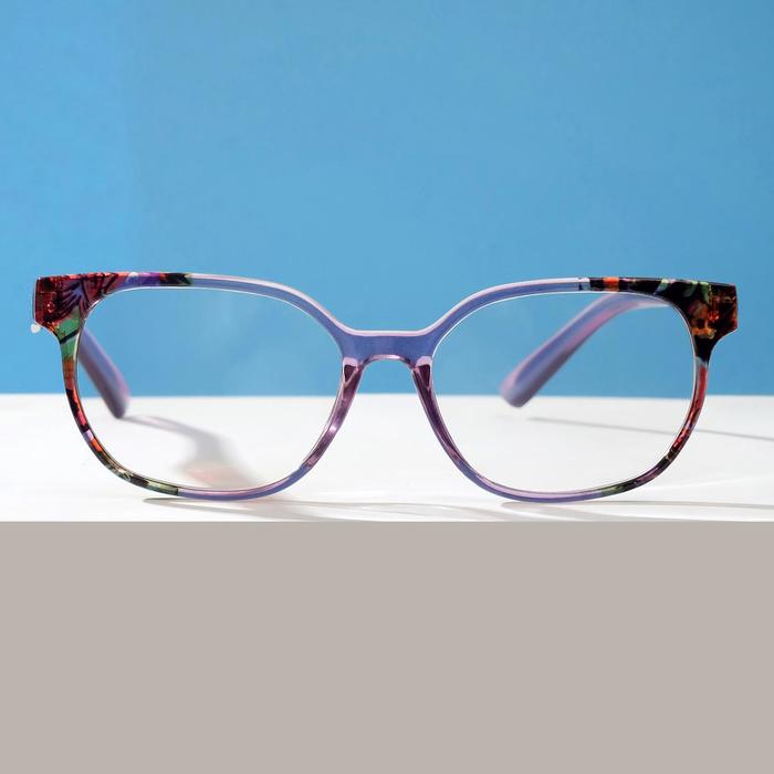 - Фиолетовая пластиковая оправа привлекает внимание и придаёт образу оригинальность;